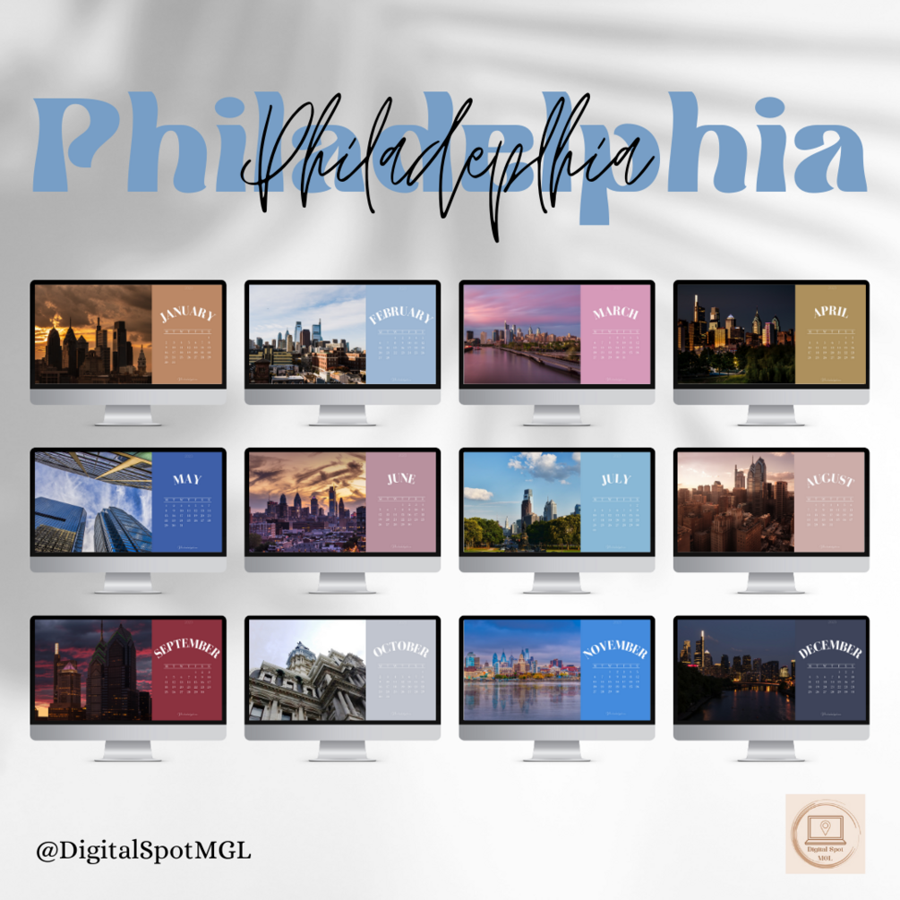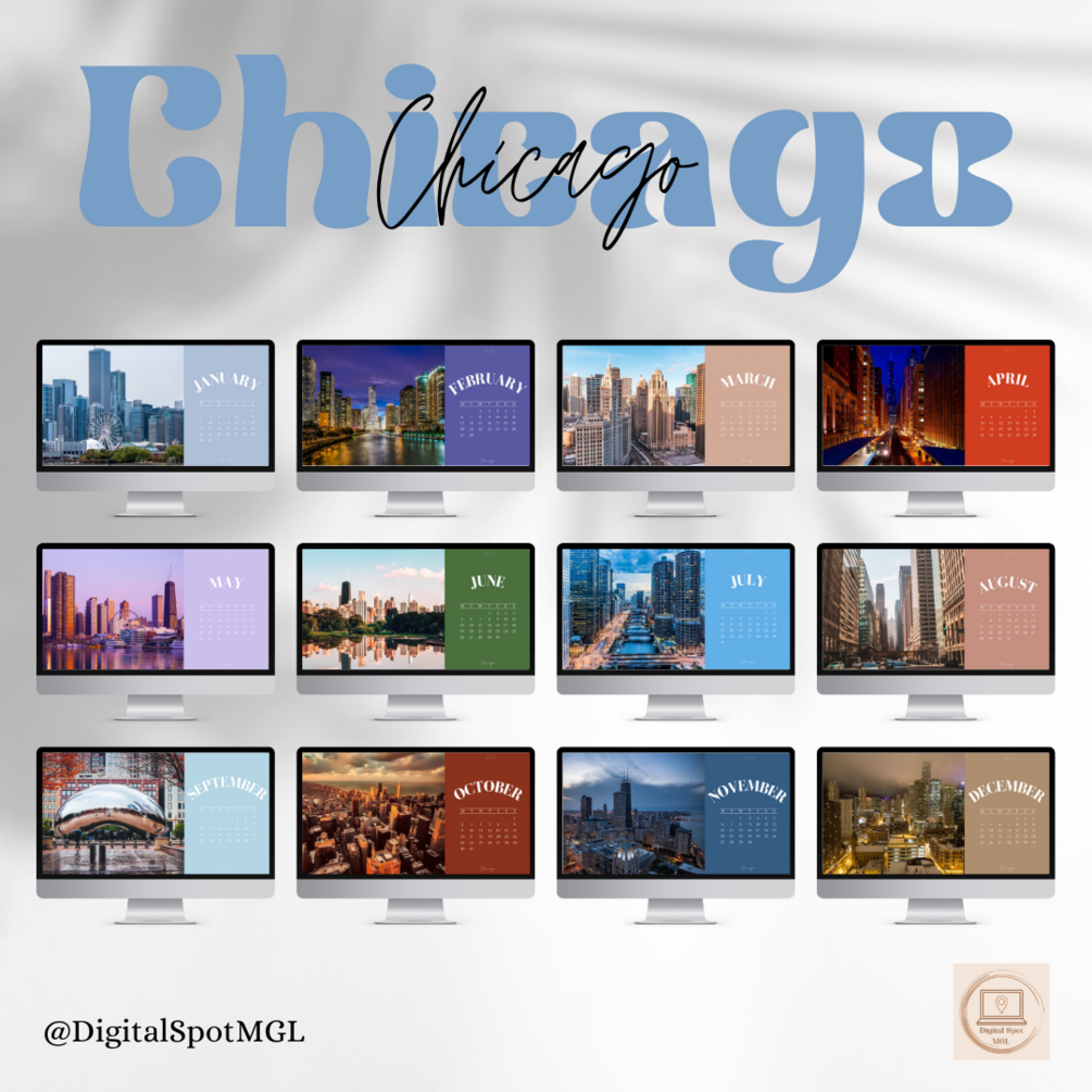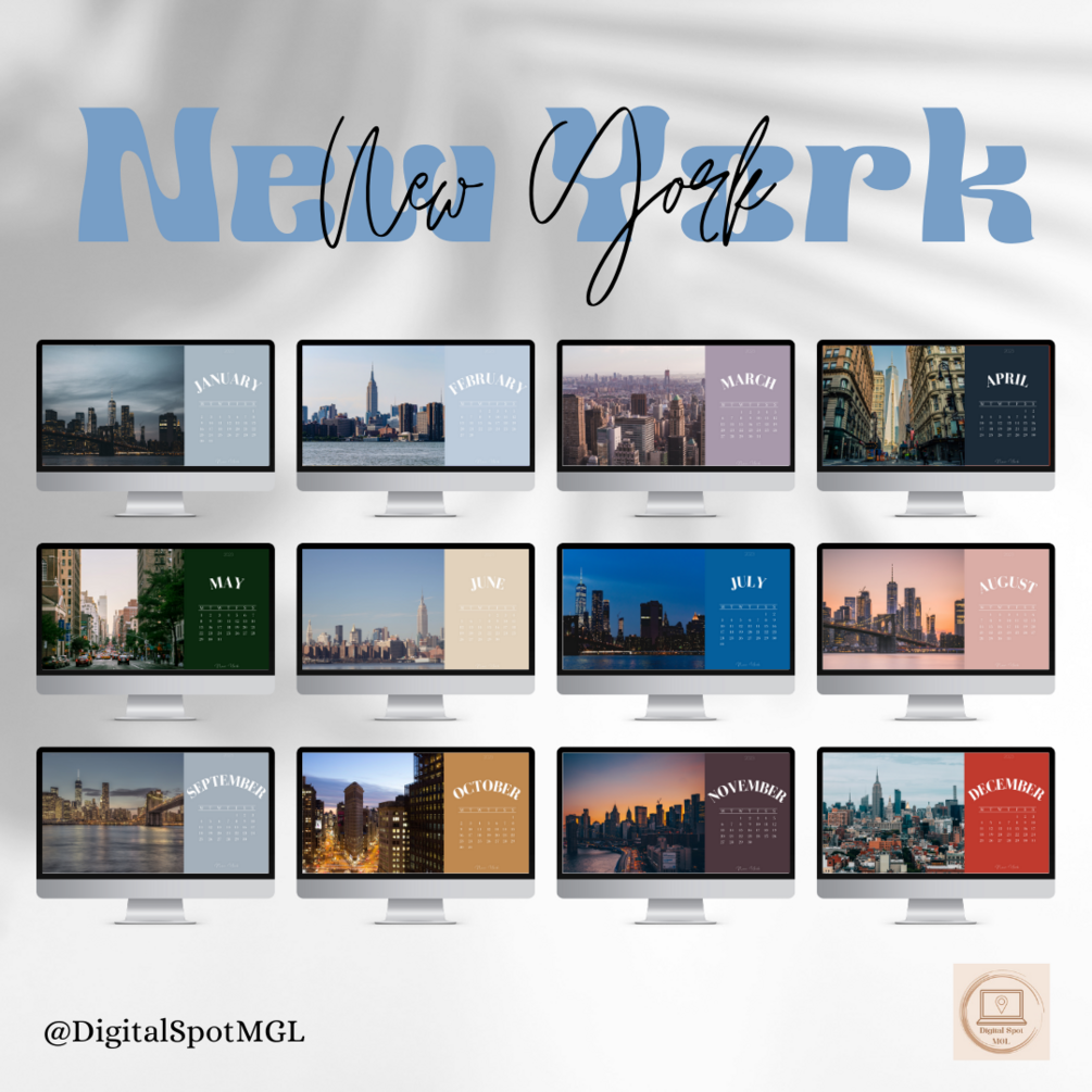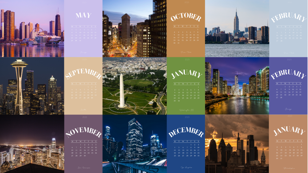 Digital monthly calendar for 2023 & 2024 with city images for your computer background.